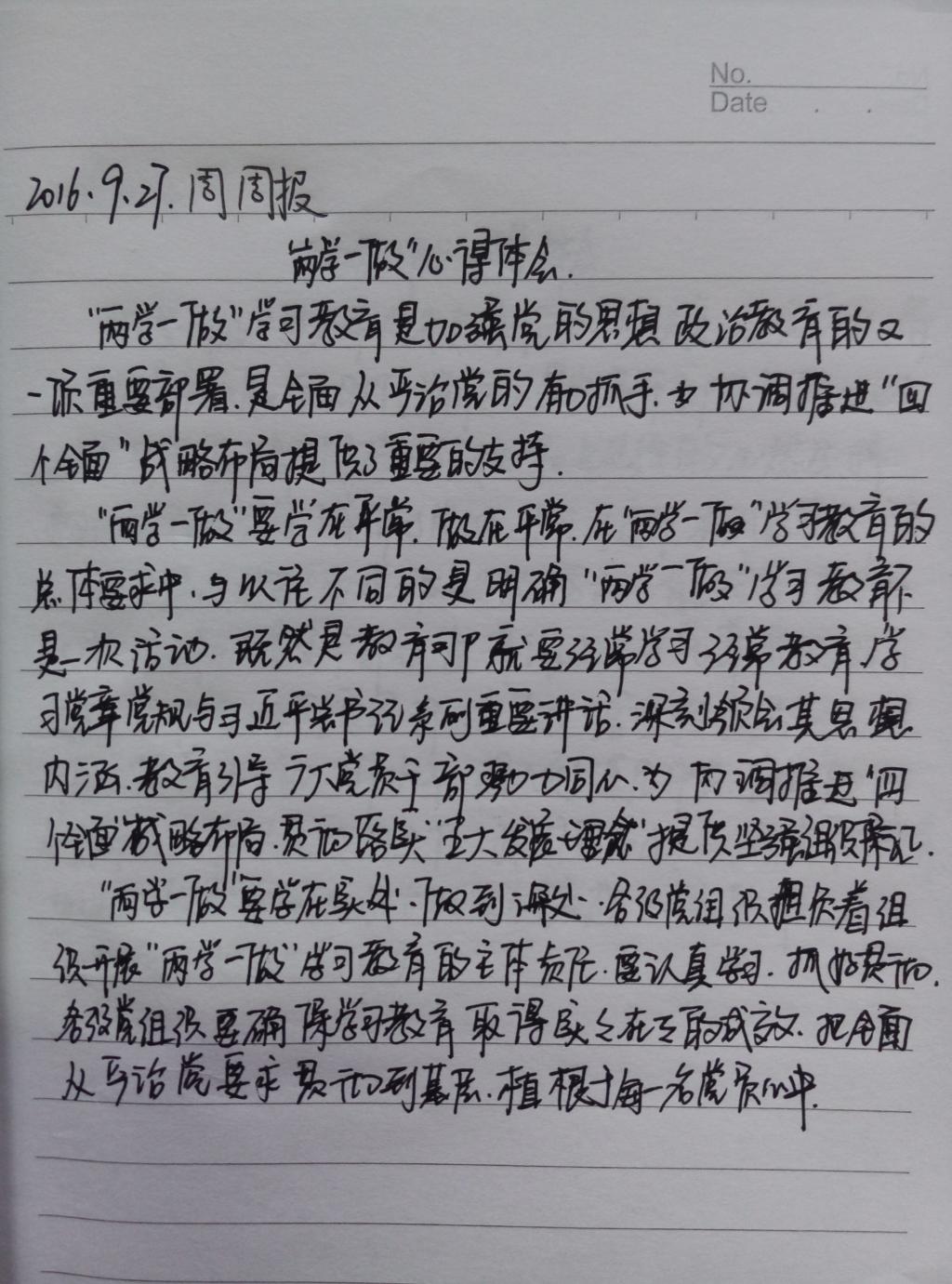 为积极响应党支部重点围绕“两学一做”学习教育常态化制度,深入学习党章,我院于2016年9月开展特色活动——工作纪实周周报。通过工作纪实周周报这个活动,要求大家不断总结、归纳,写出自己每周的学习和工作,不断地鞭策自己,总结自己的优势所在,发现自己的不足。