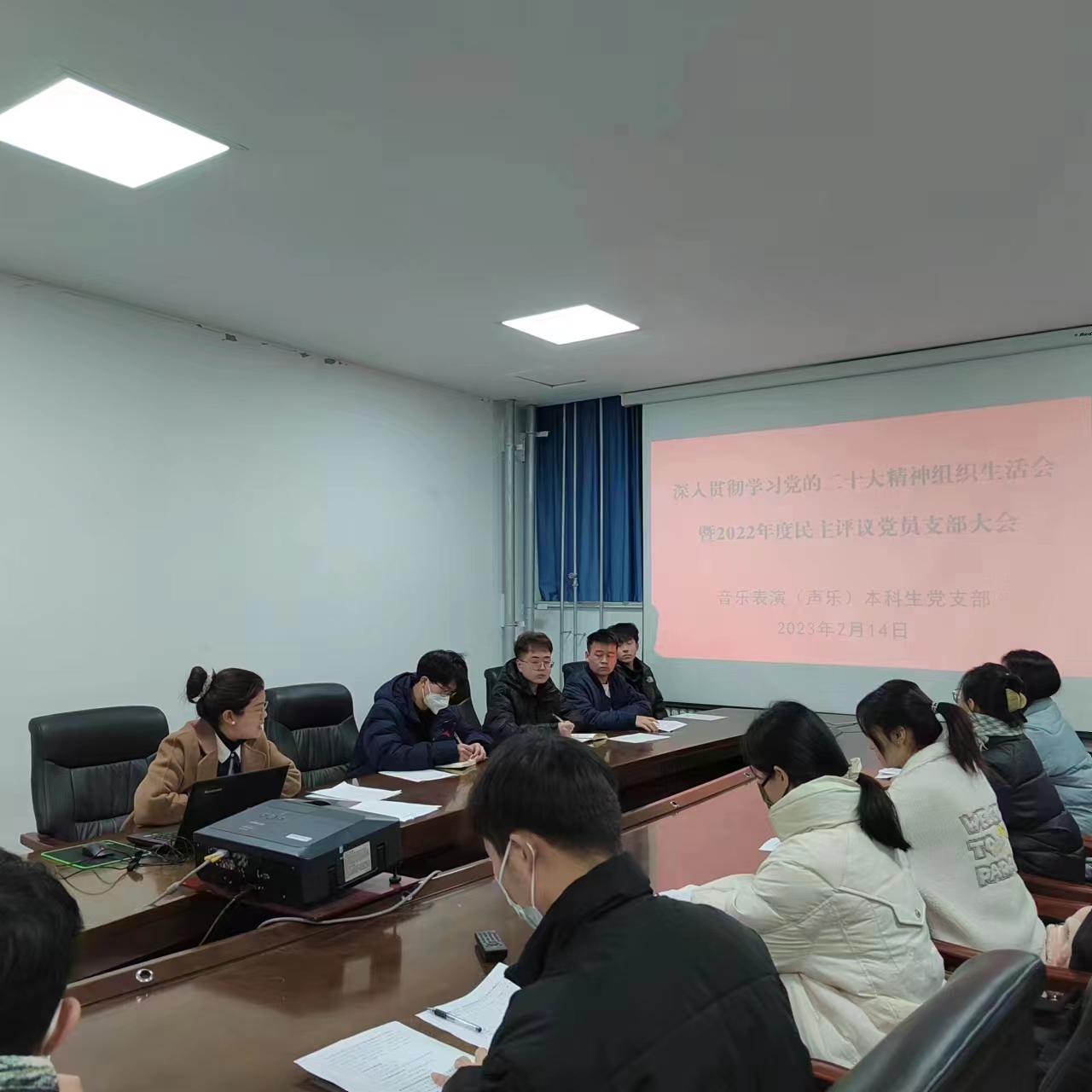 2023年2月14日,音乐表演(声乐)本科生党支部在音乐楼会议室101开展深入贯彻学习党的二十大精神组织生活会暨2022年度民主评议党员支部大会。会议由学生党支部书记陈慧洁主持,支部全体党员参加会议,各位党员同志结合自身的学习情况、工作情况、群众意见,实事求是开展批评与自我批评。