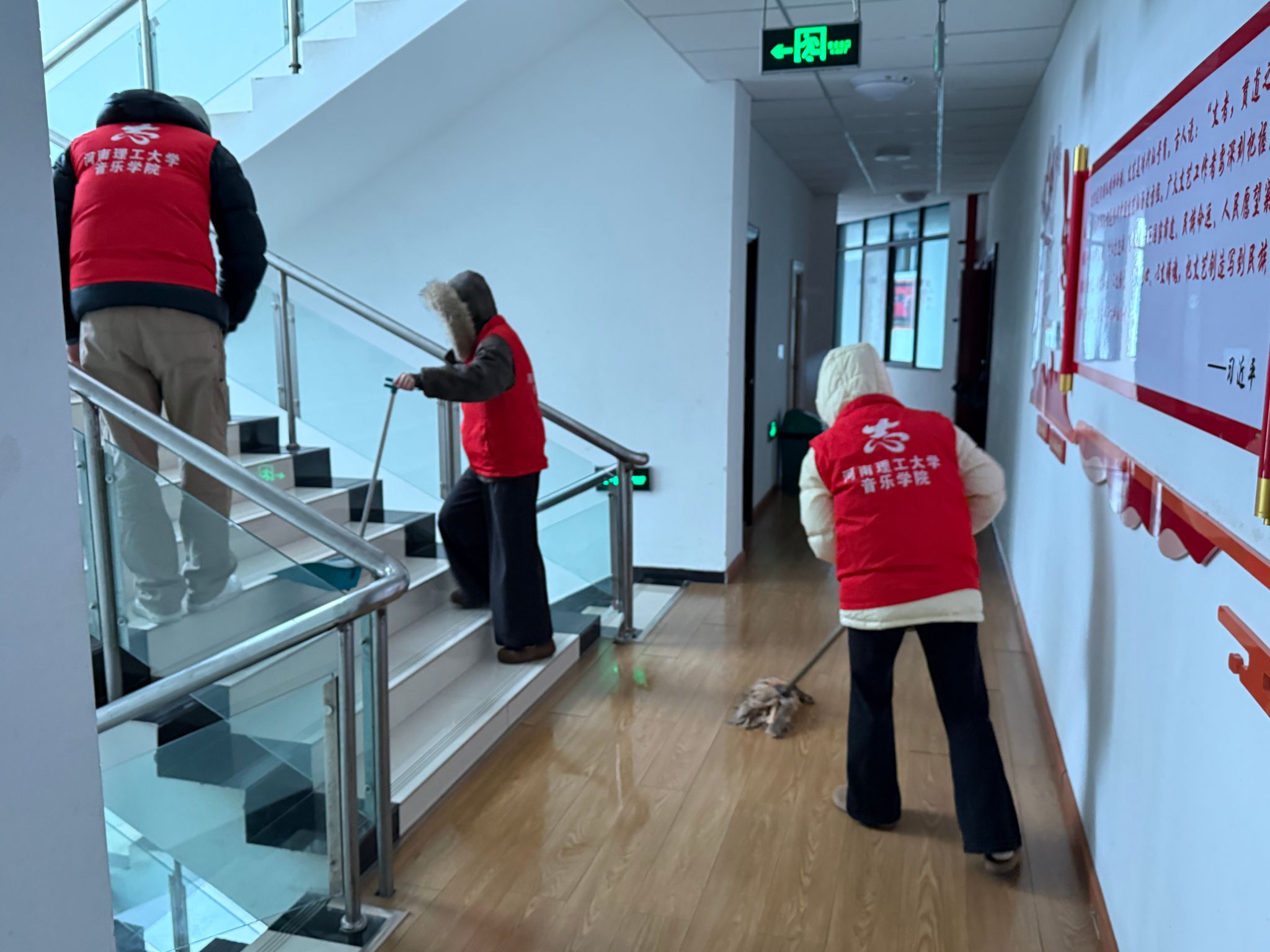 经过近两小时的共同努力,学院楼内公共区域环境焕然一新,走廊整洁、楼梯明亮,整体学习环境得到明显提升。