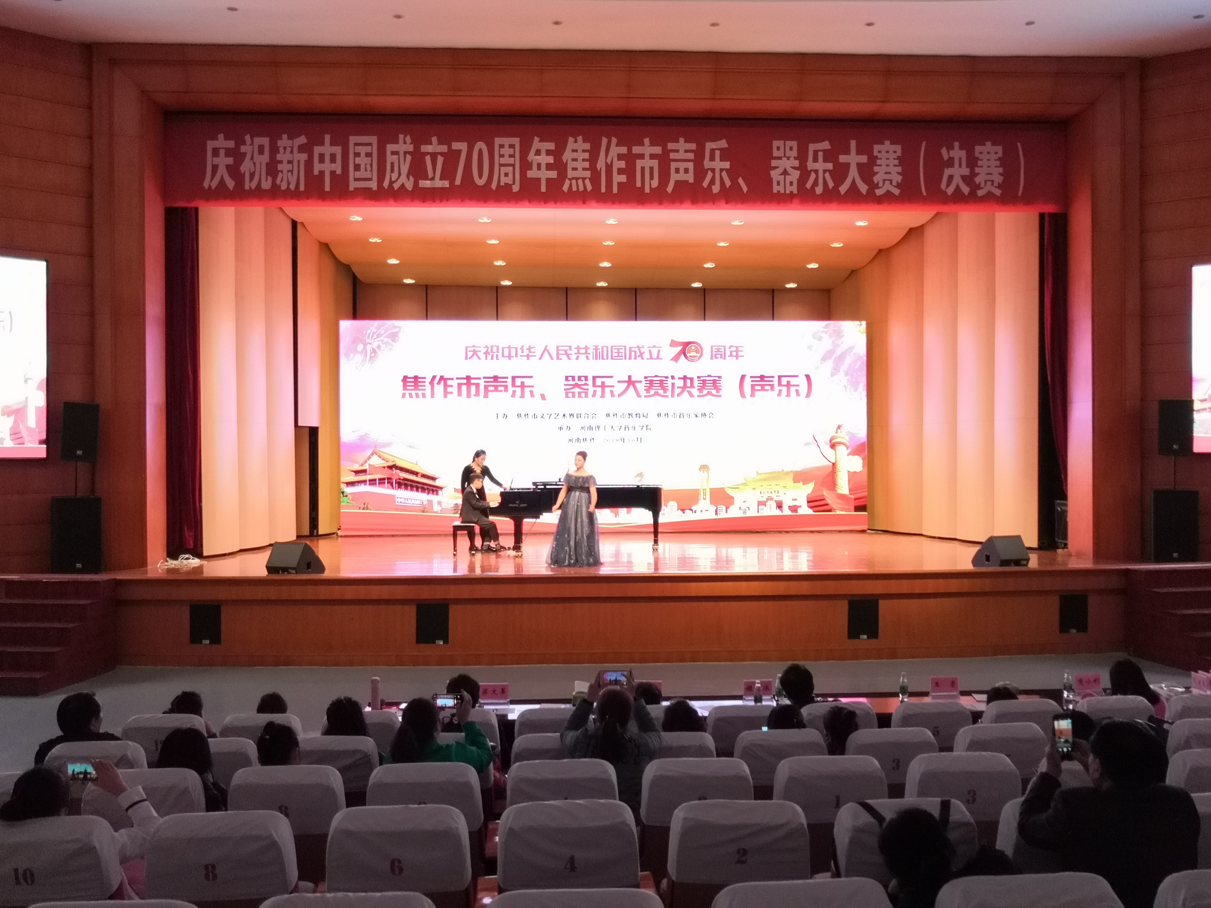 为庆祝新中国成立70周年,贯彻落实习近平总书记关于文化文艺工作的重要论述精神,积极担当“举旗帜、聚民心、育新人、兴文化、展形象”的使命任务,10月27日,由焦作市文联、焦作市教育局、焦作市音乐家协会联合主办,我院承办的焦作市声乐、器乐大赛决赛在我校明德楼音乐厅举行。来自全市大中小学及社会音乐爱好者的近百名参赛选手用娴熟的演奏技艺和动人的歌喉,带来了一场精彩绝伦的视听盛宴。我院院长李新现担任本次大赛组委会主任。