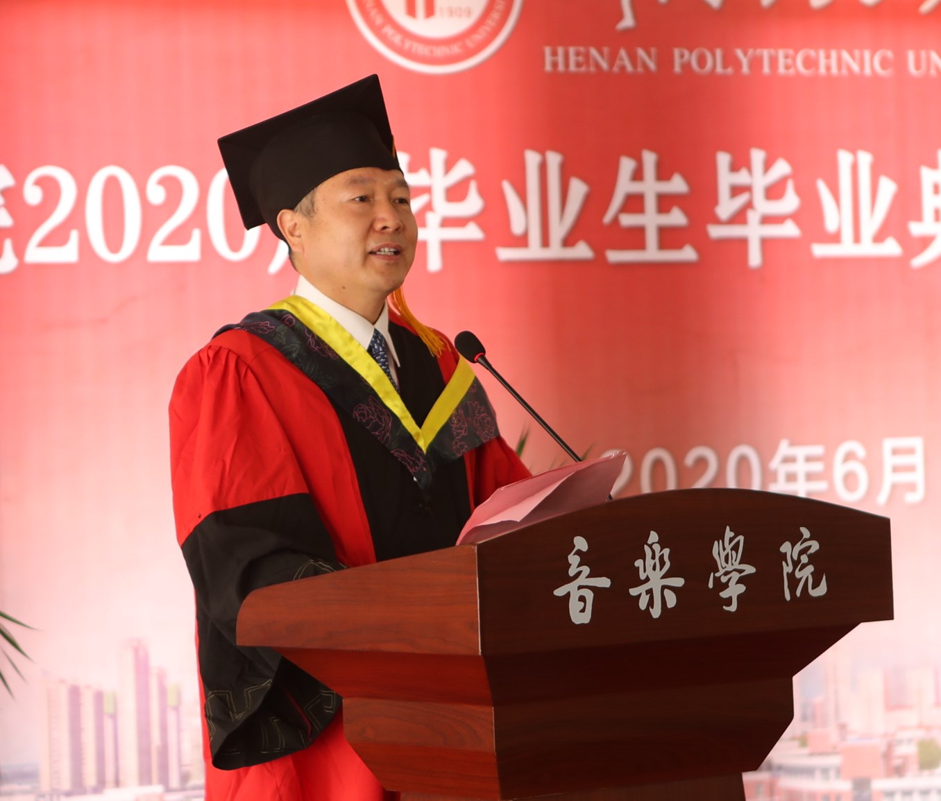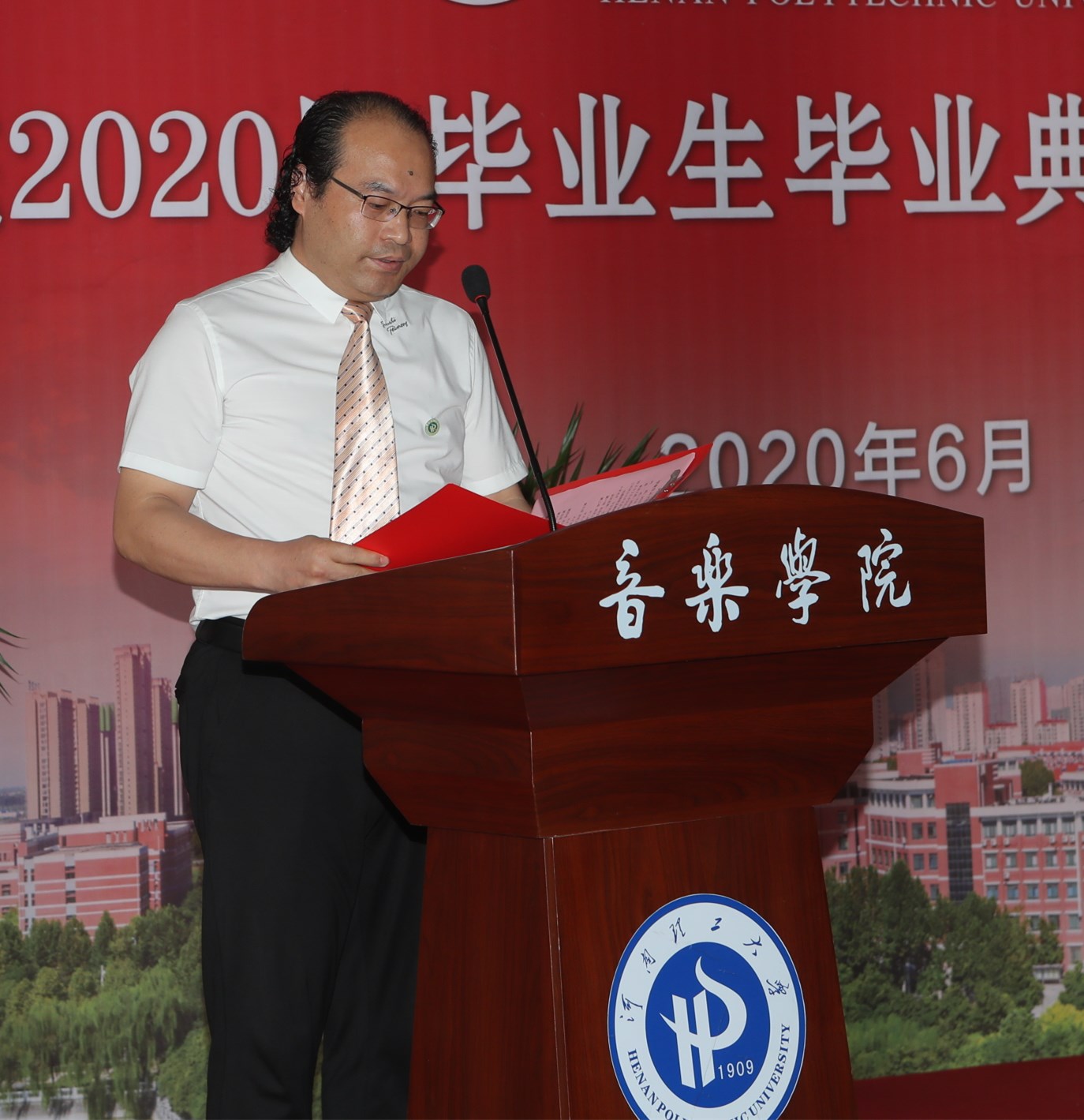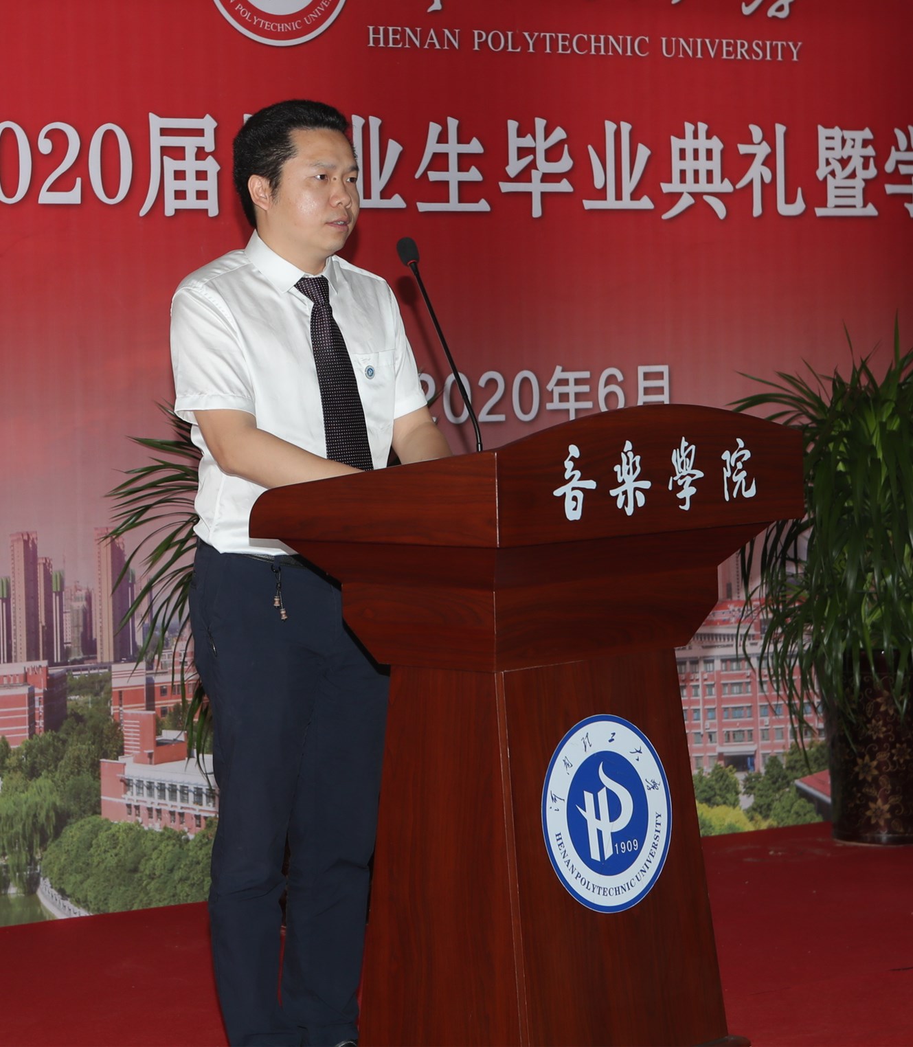 院长李新现讲话,他深情地回顾了同学们四年来的成长,对同学们的未来提出了殷切的期望。一是要有清醒的自知。知己知彼,才能处事不惊。要学会从小事做起,从点滴做起,从现在做起,积少成多、聚沙成塔、汇涓成河,不断完善自己、丰富自己。二是要有合理的选择。选定自己的人生目标,做好自己的人生规划。选定了对的方向,就要坚持下去。三是要有无悔的担当。希望大家始终保有我们理工音乐人“把灾难当教材”的勇气和“与祖国共成长”的担当。始终葆有向上的定力,始终凝聚向善的力量,始终保持向前的勇气,留住梦想,赢得未来,让绚丽的音乐之花为祖国和人民绽放!最后,李新现表示学院将永远与广大校友一起砥砺前行,欢迎大家常回学院看看。