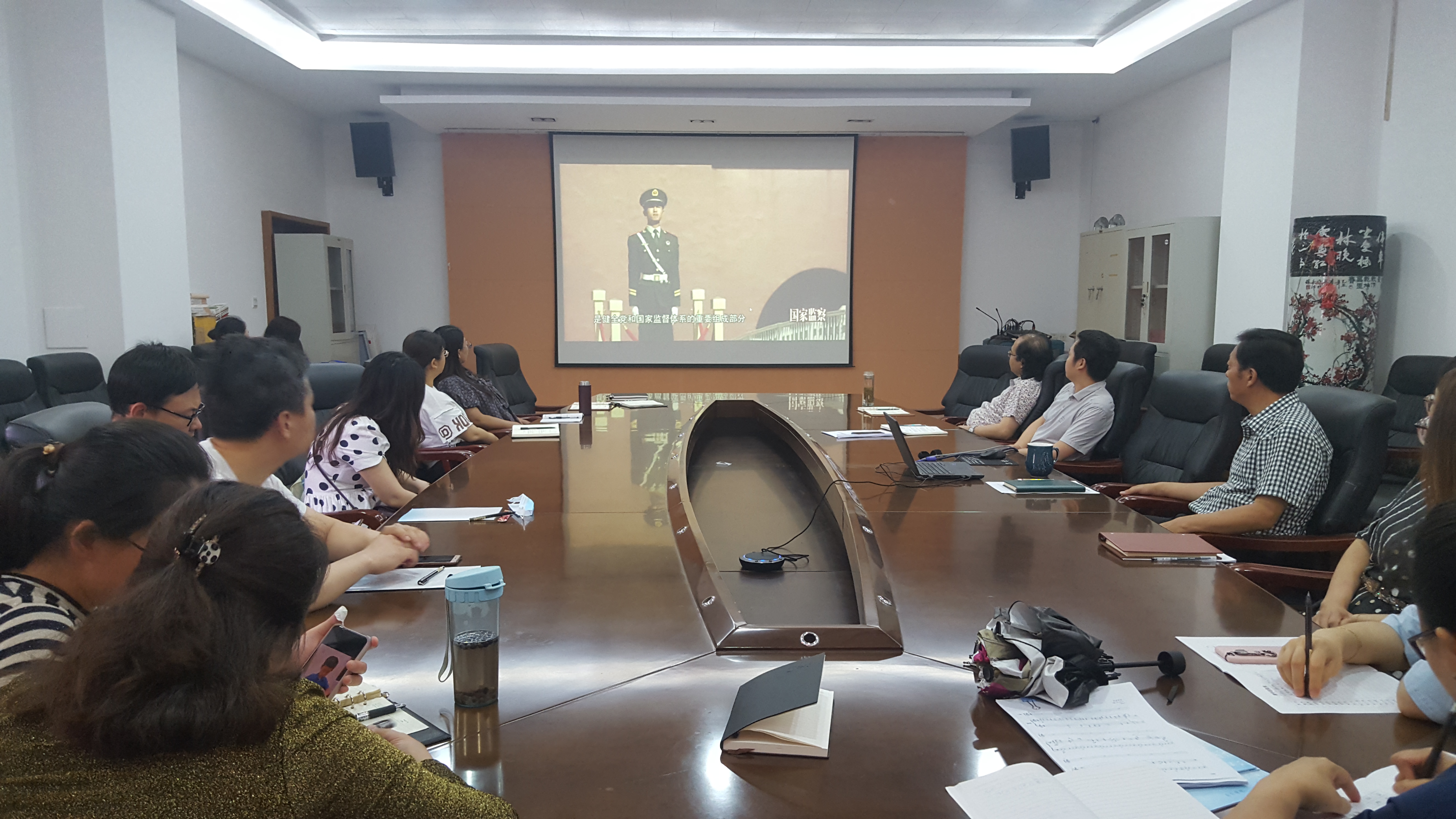 根据学校《2020年党风党纪教育月活动方案》活动安排,6月9日,学院党政领导带领全体教工在101会议室集中观看了主题警示教育片《国家监察》。