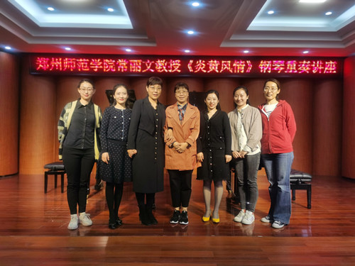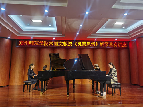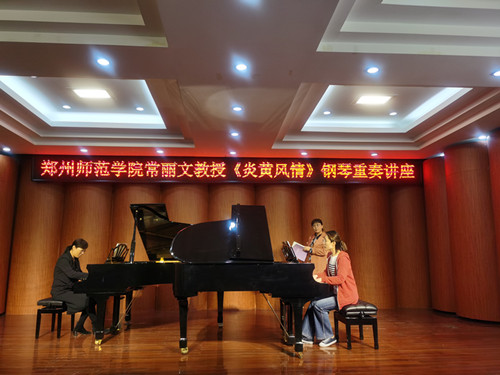 4月28日上午,应学院邀请,郑州师范学院常丽文教授在文综楼一楼音乐厅举行了《炎黄风情》双钢琴重奏学术讲座。我院全体钢琴教师和部分器乐学生参加了学术交流。