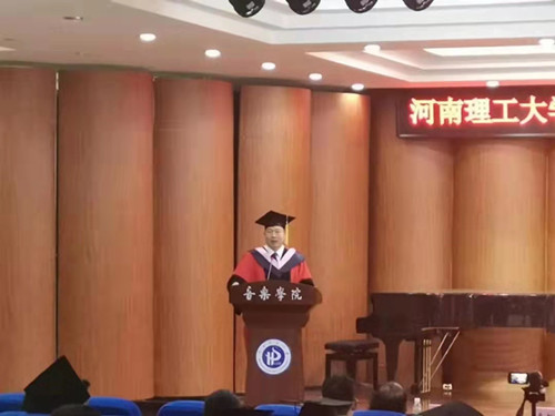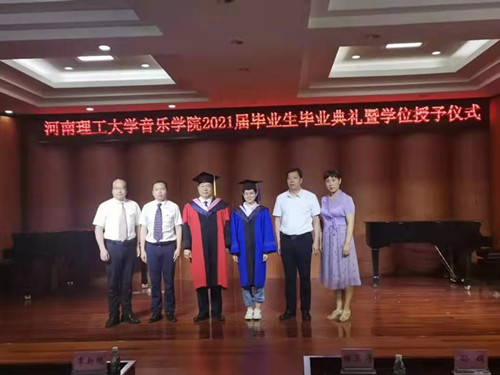 院长李新现为优秀毕业生代表颁发毕业证书,并为所有获得硕士学位、学士学位的同学一一拨正流苏、颁发学位证书并合影留念。最后,李新现在典礼上对即将步入新的人生征程的同学们提出了殷切希望。一是要感恩母校,勇于创新。希望同学们在新的岗位上,传承和发扬学校“明德任责”校训,践行“好学力行”校风和“勤勉求是”学风,勤奋工作,敢于担当,勇于创新,争取在新的岗位上取得更加优异的成绩。二是要感恩时代,接续奋斗。同学们是与新时代同向同行、共同前进的新时代青年,要锤炼品德,明辨是非曲直,矢志追求更有品位的人生;要守正创新,在教学相长中探寻艺术真谛,在服务人民中砥砺从艺初心。三是要感恩祖国,牢记使命。同学们生逢盛世,要始终听党话、感党恩、跟党走,要时刻葆有家国情怀,不断增强做中国人的志气、骨气、底气。不管将来拥有怎样的人生,都不要忘了最初的理想,不要忘了艺术人生的追求,让绚丽的音乐艺术之花为祖国和人民绽放!