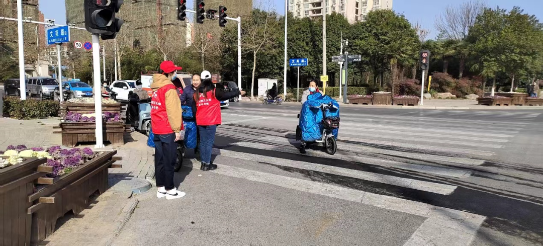 志愿者向过往十字路口的居民宣传文明交通知识和安全出行的重要性,以及对路口闯红灯、越线等候红灯、非机动车不按规定行驶等不文明交通行为进行文明劝导和协助纠正,用志愿服务理念带动市民自觉遵守交通法规,营造和谐文明的交通环境。