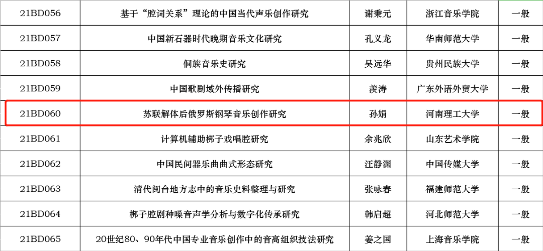 8月20日,全国艺术科学规划领导小组办公室已完成2021年度国家社科基金艺术学项目的受理申报、通讯初评、会议评审、网上公示等程序,公布了2021年度国家社科基金艺术学项目立项名单。我院孙娟教授的艺术学项目“苏联解体后俄罗斯钢琴音乐创作研究”予以立项。