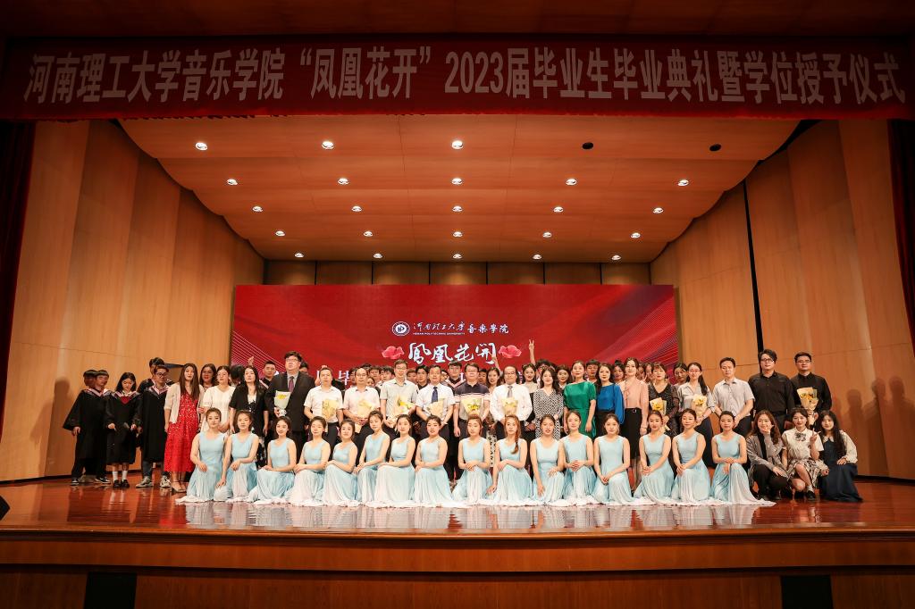 南风再轻扬,凤凰花又开。6月20日下午,明德楼音乐厅座无虚席,音乐学院“凤凰花开”2023届毕业生毕业典礼暨学位授予仪式在隆重热烈的氛围中顺利落幕。校工会主席郭相春应邀出席为毕业生拨穗正冠并讲话,校党委统战部部长杨玉海、校团委书记支光辉、研工部部长平瑞、公共艺术教育中心主任兼教务处副处长孙娟、学工部(处)副部(处)长赵观石、学院领导班子成员以及各系(部)负责人出席典礼。学院103名应届毕业生及部分家长、全院教师参加典礼。仪式由该院党委书记贾宝先主持。