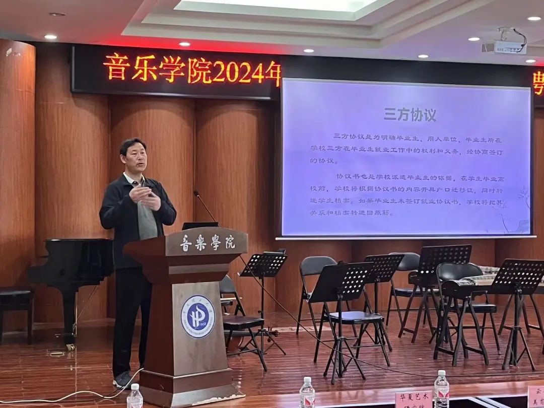 4月17日,为进一步推进2024届毕业生顺利就业,音乐学院2024年音乐舞蹈类专场校园招聘会在文综楼一楼音乐厅顺利举行。学院党委书记贾宝先出席。学院党委副书记王建军主持会议。2020级本科生、2021级全体研究生参会。