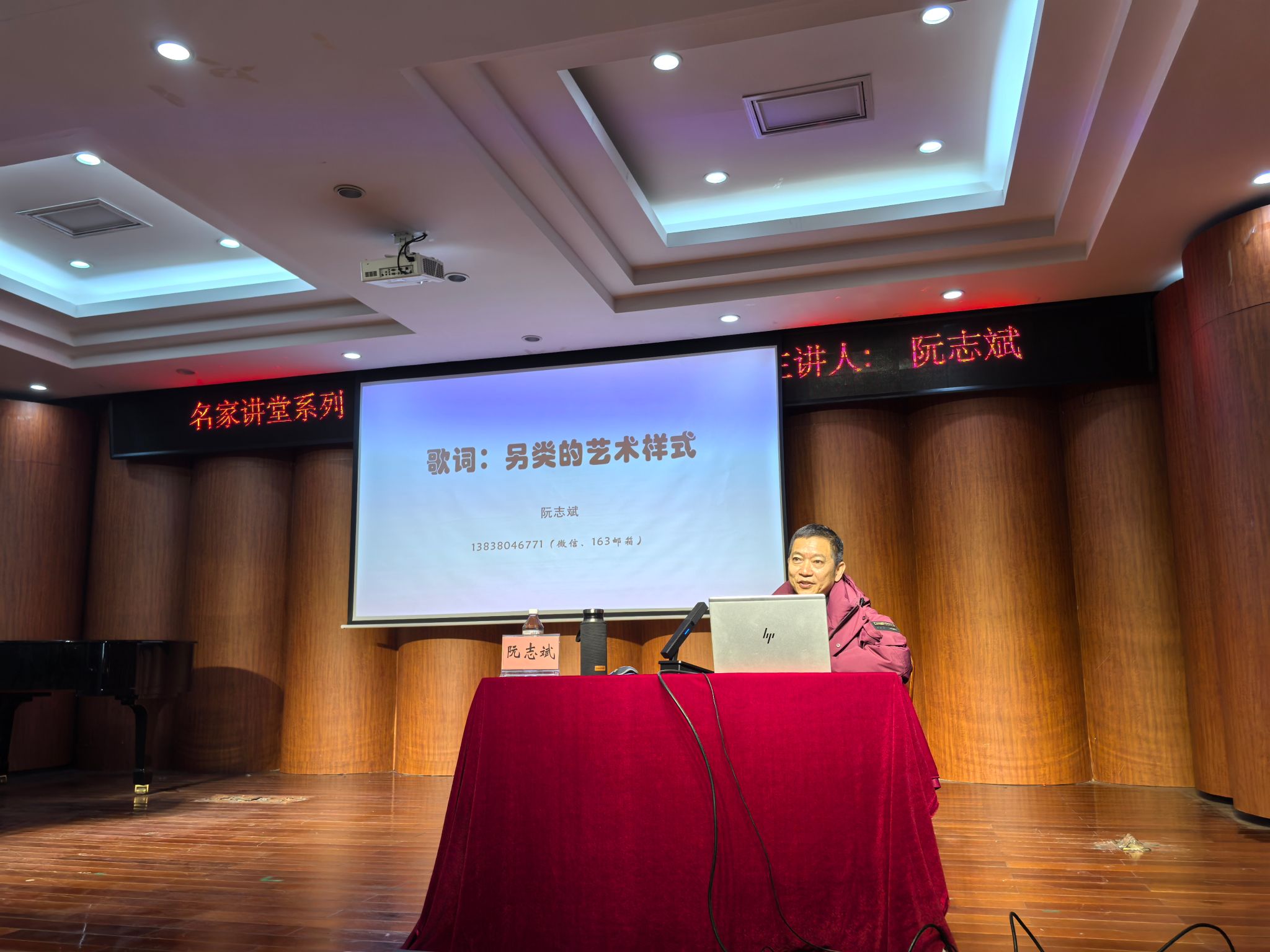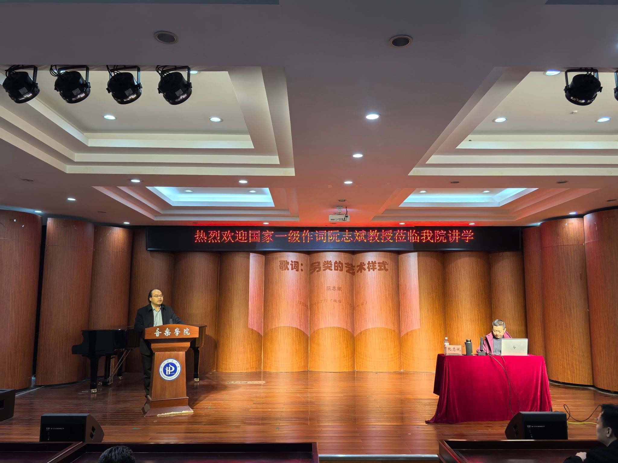 2月25日下午,音乐学院“载堉讲堂”首讲在文综楼一楼音乐厅隆重举行。国家一级作词、河南省音乐家协会副主席阮志斌作了题为《歌词:另类的艺术样式》的专题讲座。讲座由音乐学院执行院长马安平主持,学院领导班子、师生代表等100余人参加了本次讲座。