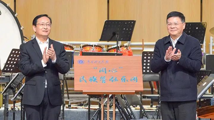 杨海强和邹友峰为河南理工大学“同心”民族管弦乐团揭牌。
