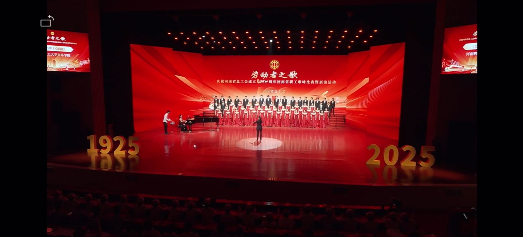 9月8日晚,我校音乐学院力行合唱团应河南省总工会邀请,参加“劳动者之歌”庆祝中华全国总工会、河南省总工会成立100周年河南省职工歌咏比赛暨展演活动,并作为唯一特邀高校展演团队,表演压轴曲目《亿万职工心向党》,获得省总工会有关领导和广大观众高度赞誉。