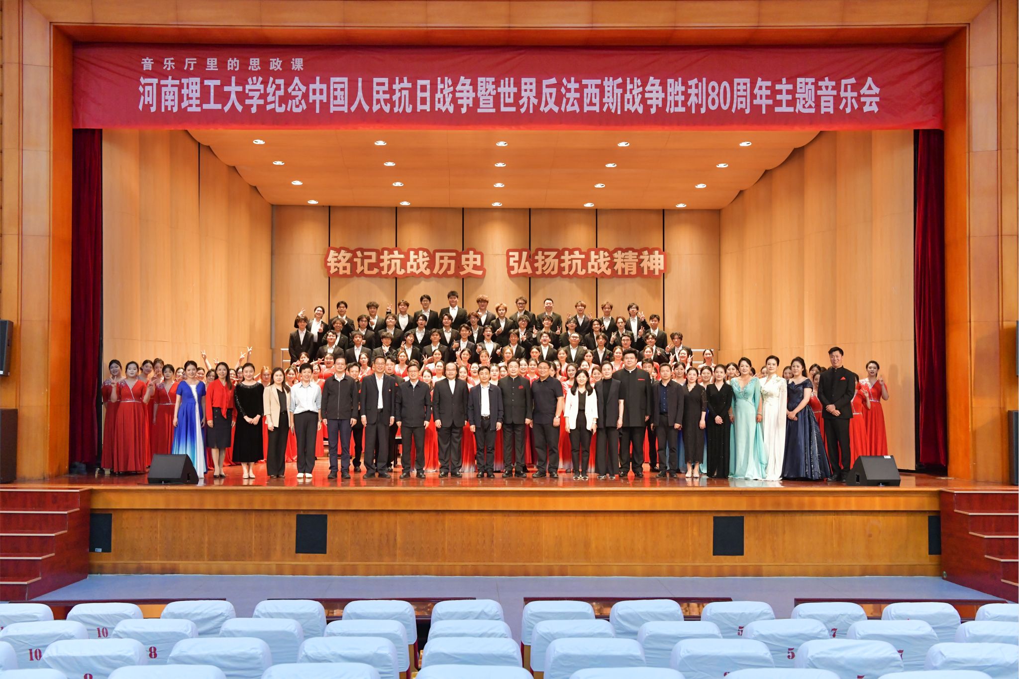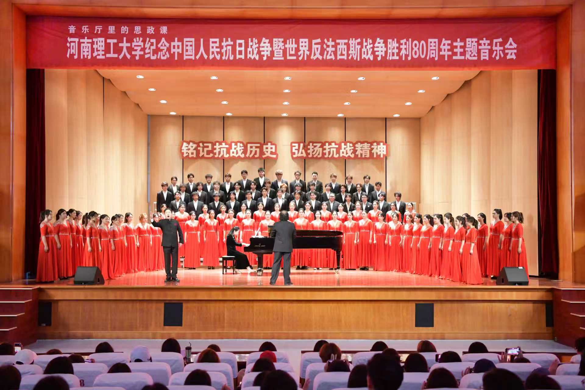9月29日,由党委宣传部主办、音乐学院承办的“音乐厅里的思政课——河南理工大学纪念中国人民抗日战争暨世界反法西斯战争胜利80周年”主题音乐会在明德楼音乐厅举行。校党委书记刘永涛、校党委副书记白鑫刚、校纪委书记赵晓军、副校长丁亚红,党办、宣传部、统战部、校工会、教务处、研工部等单位负责人,以及各学院师生代表计700余人观看演出。音乐学院执行院长马安平、教师王芳分别担任音乐会合唱指挥和导聆人。