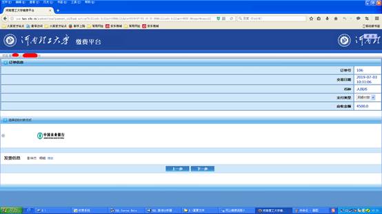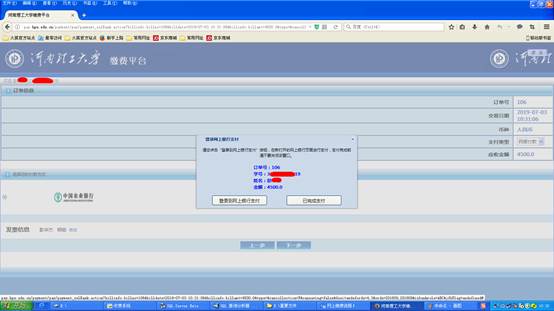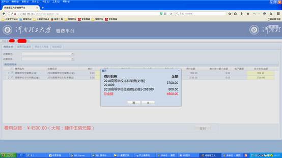 注:a、选择要缴费的费用项,点击“支付”按钮,进入下图(3)的界面。备注:选择一项费用必须全额支付。