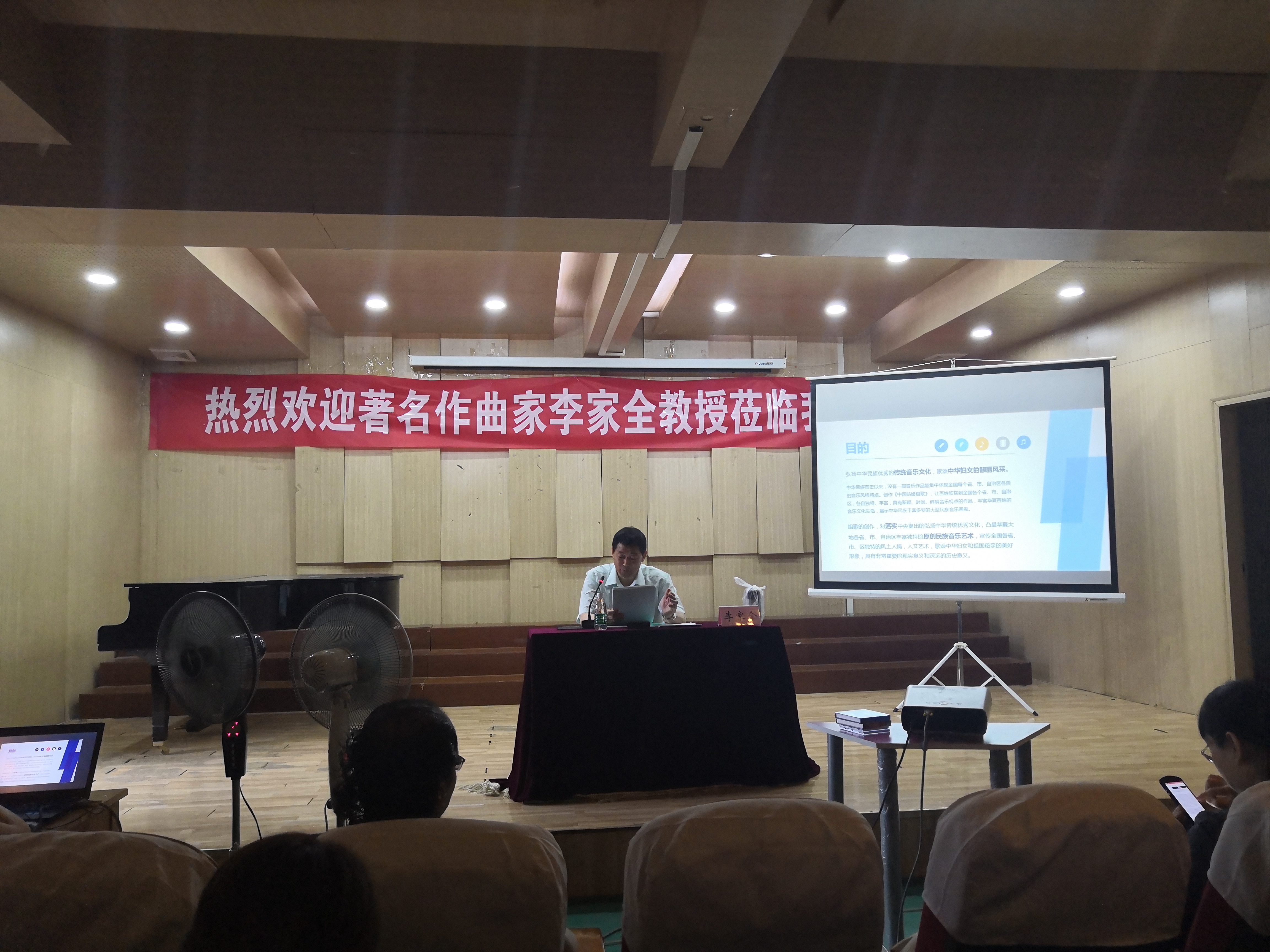 6月12日上午,应音乐学院之邀,著名著名作曲家李家全教授在文综楼小音乐厅作了题为《运用中国传统优秀音乐进行歌曲创作 》的学术报告。我院百余位师生共同聆听了此次讲座,会议由我院副院长马安平主持。