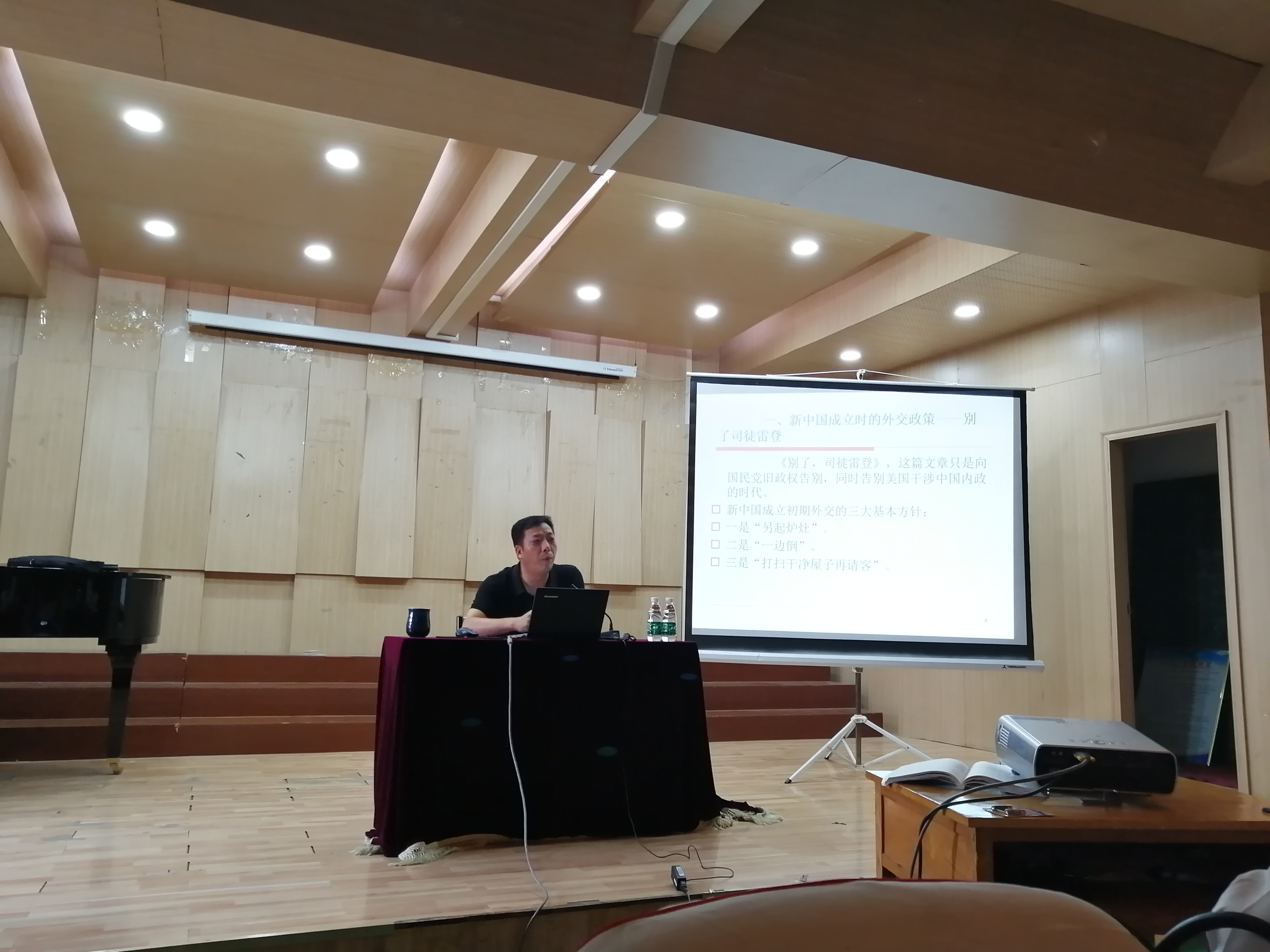 杨书记讲课的题目是《中美关系70年风云掠影》。杨书记首先从当前中美贸易战引入,分别从新中国成立时的外交政策——别了司徒雷登;中国外交关系的晴雨表——东边日出西边雨;当前中美关系——青山遮不住等三个方面,讲述了中美关系70年的风雨历程。他重点强调了今年是中华人民共和国成立70周年,中国将坚定不移的走自己的路,踏踏实实的办好自己的事,让中国人民过上更美好的生活,实现中华民族的伟大复兴。杨书记的讲课逻辑严谨,条理清晰,层层推进,选取多个特色鲜明的例子,对中美关系这一主题进行了深入的剖析,将对我们正确认识中美关系提供了很大帮助。