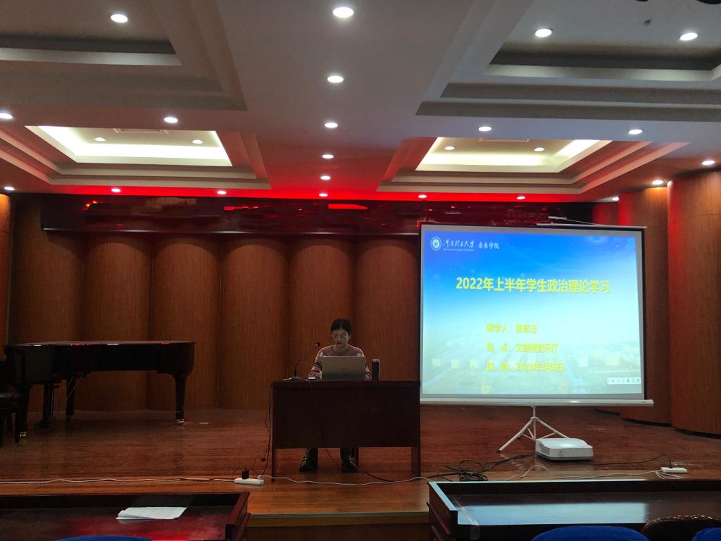 2022年3月8日下午,音乐表演(声乐)本科生党支部党课学习在文综楼小音乐厅召开。党支部书记陈慧洁老师主讲,主题为《从百年党史汲取奋进力量》,由中央党史和文献研究院副院长王志民在人民日报发表。