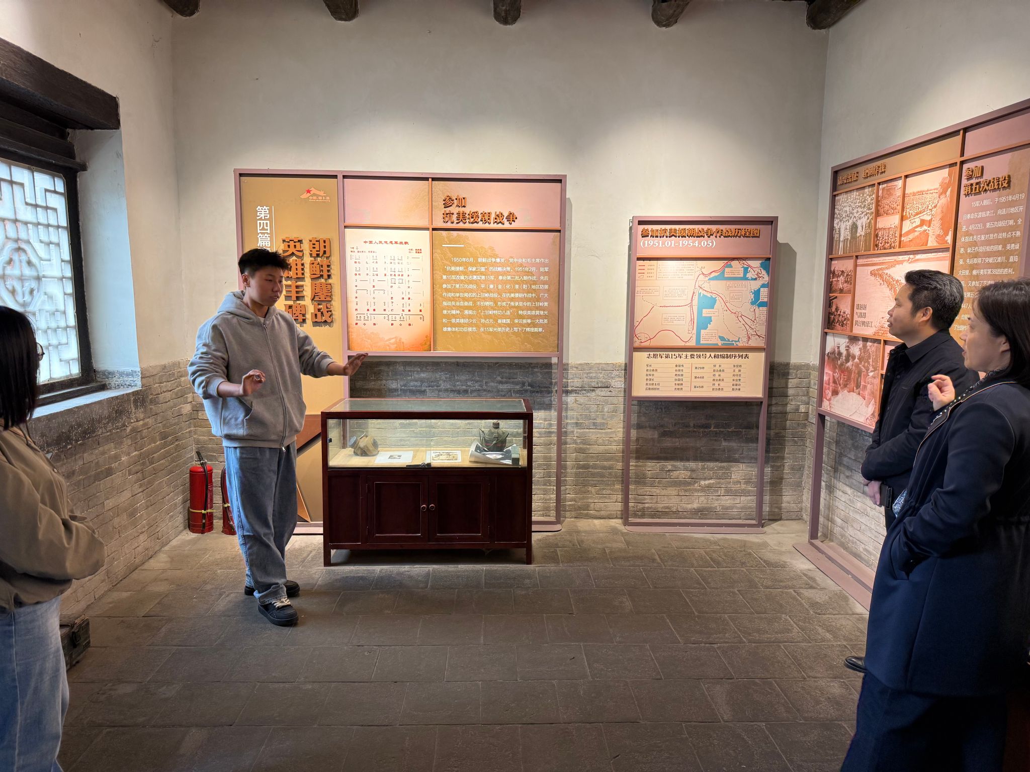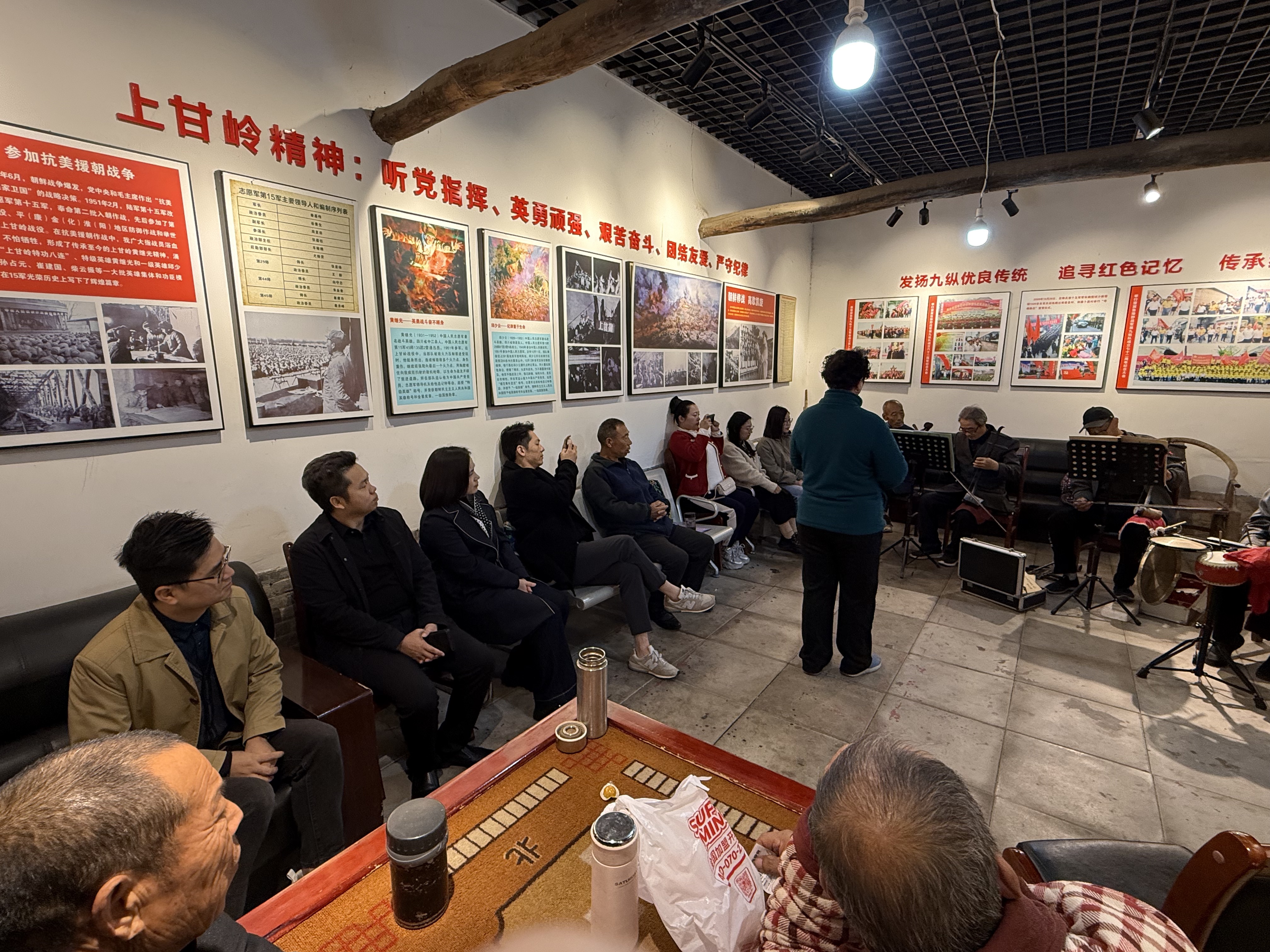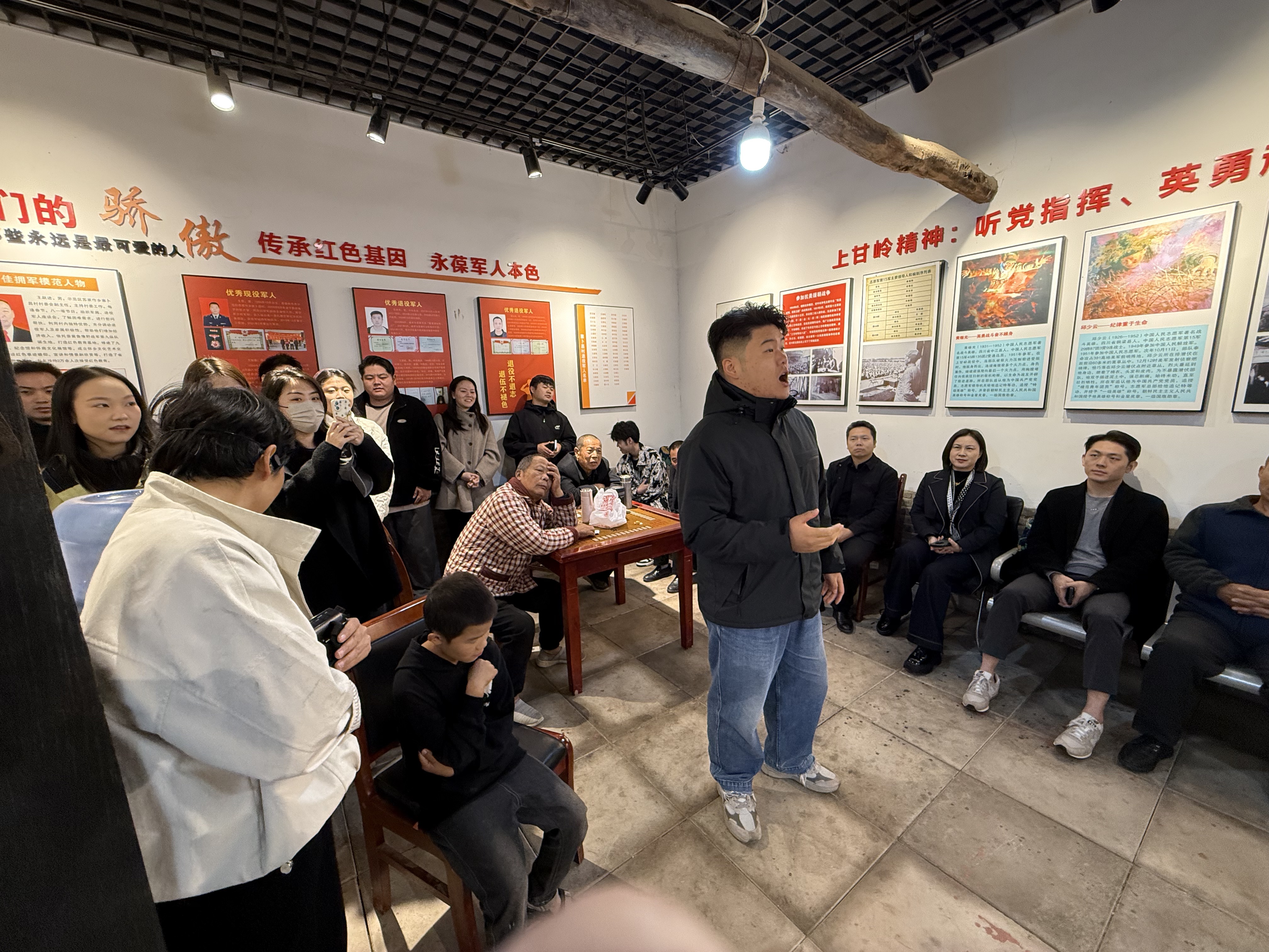 在讲解员引导下,师生穿行于400余间明清民居间,青石街道溜光水滑,砖雕石刻栩栩如生,“门外拥珠旗报国曾持三尺剑,庭前罗玉树传家唯有五车书”的对联诉说着先辈的家国情怀。当行至曾召开九纵成立大会的遗址旁,25级合唱指挥方向硕士马博洋举起指挥棒,《中国人民志愿军战歌》的激昂旋律骤然响起,师生齐声合唱,红色情怀与古村的革命记忆共振。