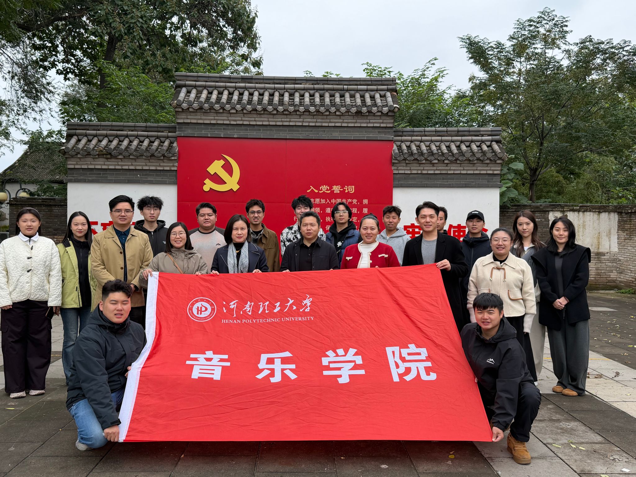 【河南理工大学音乐学院师生在寨卜昌村红色地标前的集体合影】