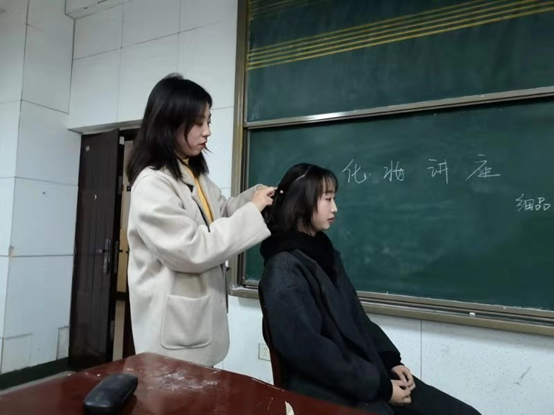 期间,三位主讲人分别从色彩、眉眼、修容、发型、护肤等方面给在场学生做了一个详细易懂的讲解,让学生对化妆有了一个简单的认识。主讲人陈东对有关护肤的知识,从皮肤状况、面部清洁、面部保养方面进行了分析,对于不同肤质的同学提出了相应的建议,并且告诫大家要注意饮食和作息。主讲人王淑仪根据妆容方面的问题对大家进行讲解。她邀请了一位女同学作为模特,分析了该同学的肤质和面容,在为其设计妆容的同时,向同学们讲解如何打底妆、画眼妆和腮红等化妆技巧,介绍不同化妆品的作用效果以及使用的注意事项。主讲人符玉娟给大家演示了蜈蚣辫和鱼骨辫的编法。在讲解过程中,结合自身经历,风格幽默诙谐,现场气氛热闹愉悦,编的发型也赢得观众的惊叹。在互动环节,学生们积极向主讲人提出疑问,主讲人一一给予解答并进行现场演示,学生们通过观看实际操作流程对化妆有了更深的了解,现场气氛十分活跃。