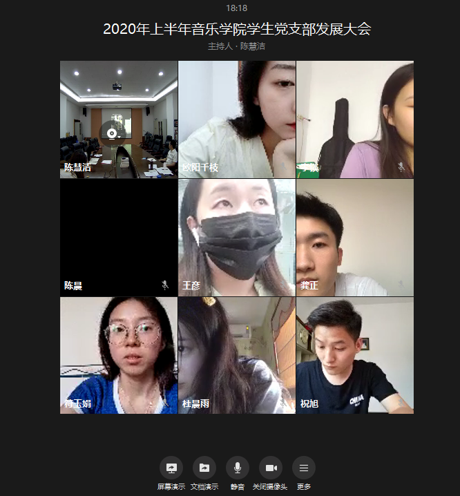 音乐学院学生党支部于2020年6月6日下午在文综楼101室召开了关于接受预备党员、正式党员的支部大会,学生党支部全体党员参加了本次会议。特殊时期,会议针对现实条件精心设计,采用线上和线下相结合的方式开展此次会议。