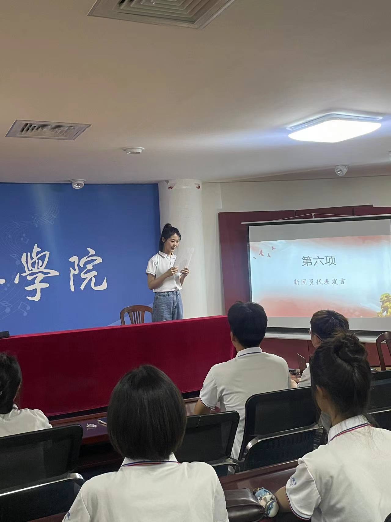 新团员代表王雅文、优秀团员代表刘静怡同学分别发表了热情洋溢的讲话,表达了她们坚定的理想信念和对团组织的忠诚。每位新团员的脸上都洋溢着自豪与激动,展现了新一代青年的朝气蓬勃和对未来的美好期许。回顾了共青团的光辉历程,并强调了新时代团员应担负的历史使命与责任。