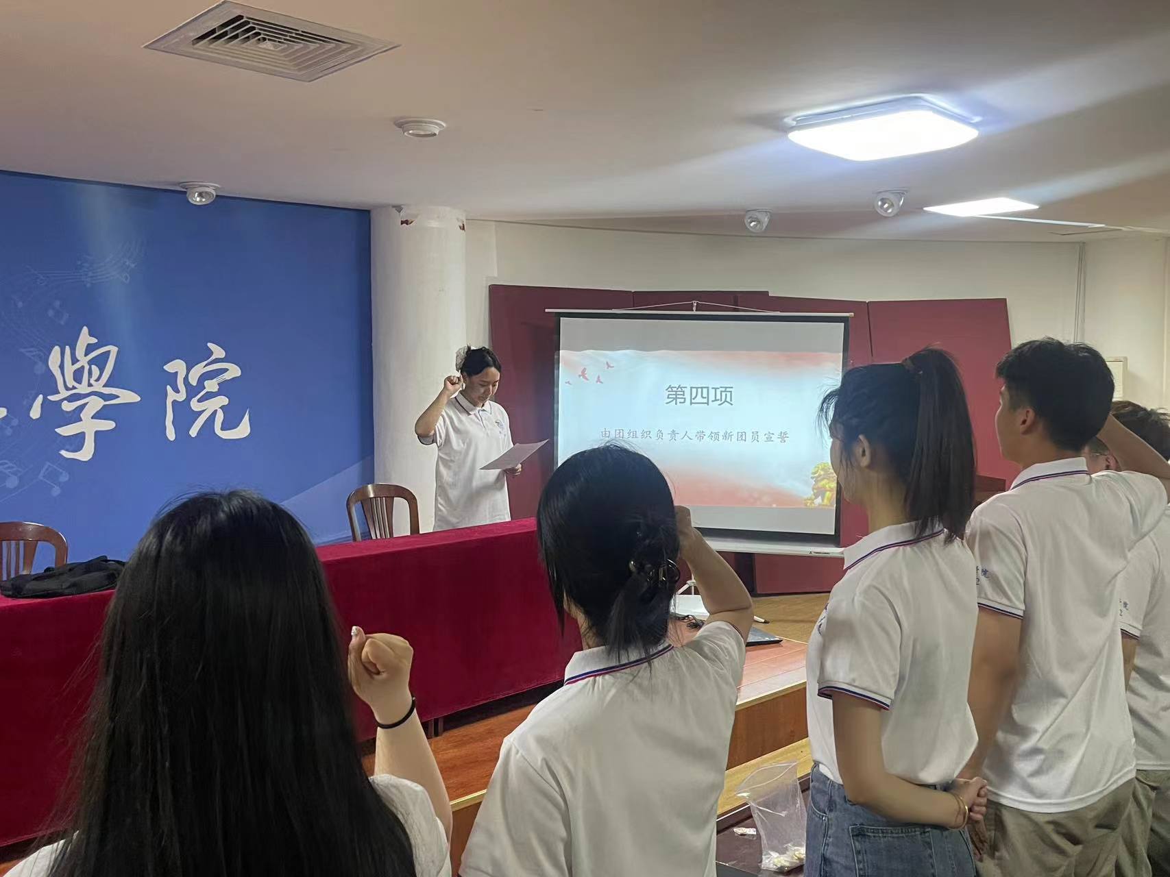 仪式开始,全体起立,奏响雄壮的国歌,随后伴随着激昂的团歌,现场气氛庄严而热烈。接着为新团员颁发团徽徽章并由优秀团员代表邓志慧同志带领新团员进行宣誓。